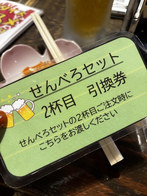 アルコール2杯、鶏串、豚串、長芋の唐揚げ、お通しが付いて¥1000のせんべろセット。