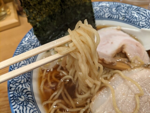 ・煮干しの香りが強い透き通った清湯スープで、日本そばのつゆのような味わいですが、後から来る鶏の旨味がラーメンであることを思い出させます。