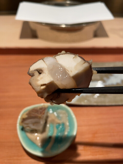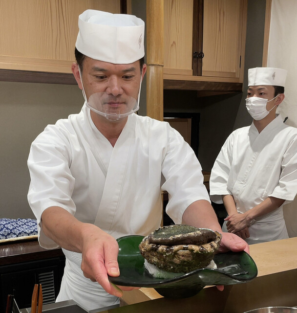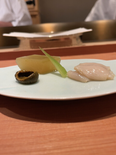 旬味 鮑の冷菜、炒り煮、鮑の天ぷら、海苔の泡焼き