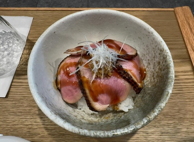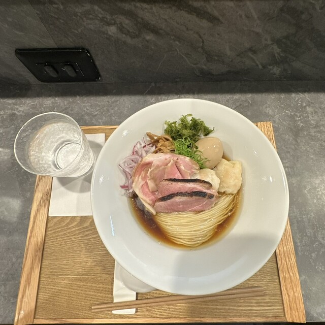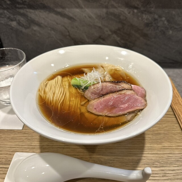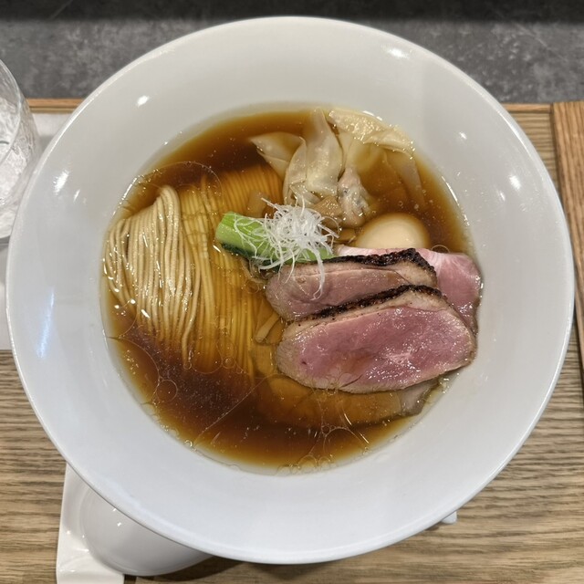 トッピングは、前回食べた醤油味と同様で、鴨ロース、神威豚チャーシュー、味付玉子、九条ネギ、アーリーレッド、メンマ、焼ばらのり、そして追加の海老ワンタン。特に海老ワンタンは前回同様、プリプリとした海老の食感や風味がはっきりと伝わり絶品でした!