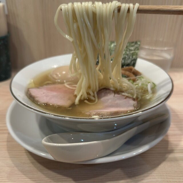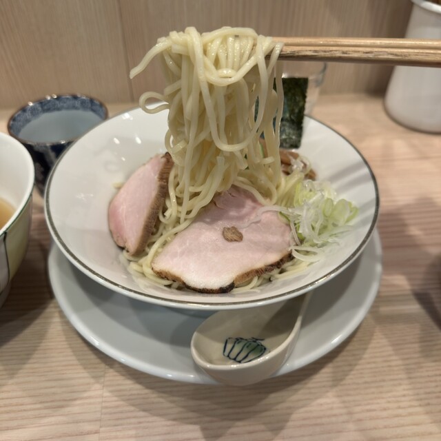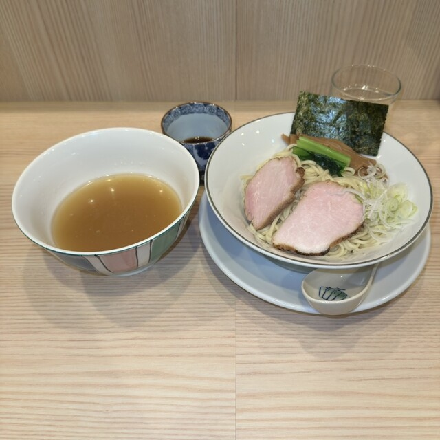 自家製の平打ち中細ストレート麺は啜り心地が抜群で、ズバズバと手が止まらない美味しさ!つけ汁は蕎麦つゆと清湯系塩の2種類がどちらも奥深く、味の対比が楽しいです。しっとり柔らかなチャーシューやシャキシャキの青菜もレベルが高く、満足度大!