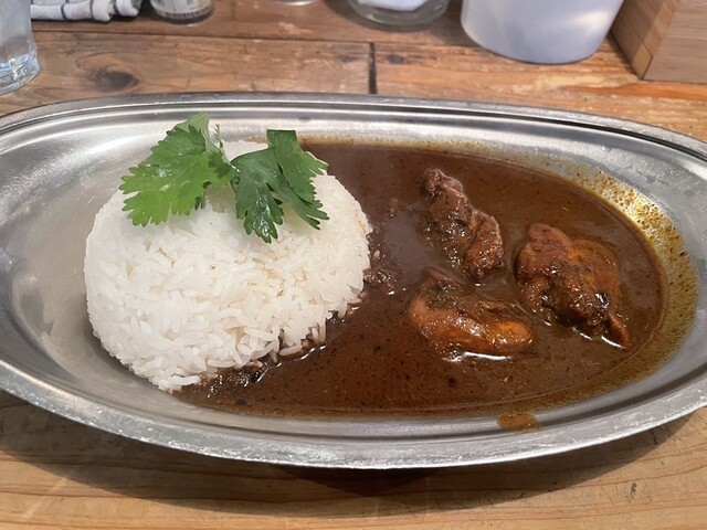 ゴロゴロと大きくスパイシーなチキン、おそらくタイ米なお米、アクセントにパクチーが、スパイスの効いたルーと混ざり合い最高。