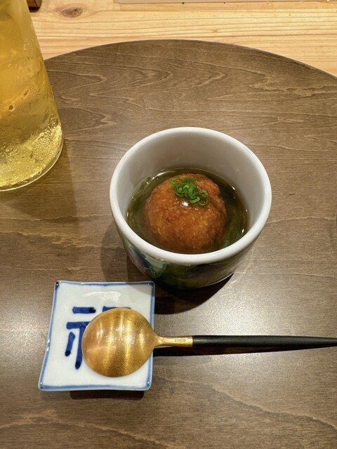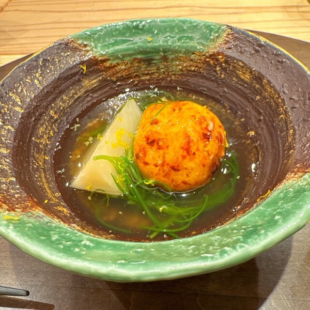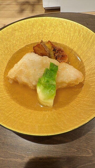 五品目、タラバガニが入った蓮根饅頭に甘エビ出汁の餡