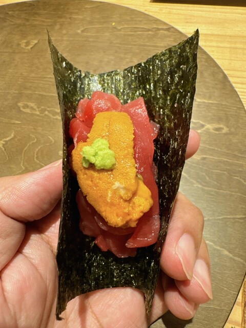 五品目、お造り、10日間寝かせた石鯛、雲丹