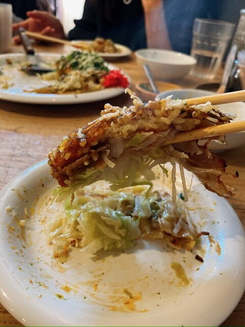 特にもっちり部分は生麺を使用しているのかプツリとした歯切れの良さもあり初めて食べるタイプのお好み焼き
