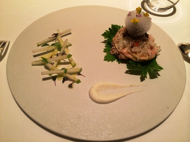 ●セイコガニとアーモンドのフラン、長野県産の青りんごを添えて