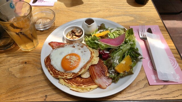 ベーコンの脂と塩気がパンケーキとの相性がいいですね。少しだけメープルシロップをかけても甘じょっぱくて美味しいです。ベーコン以外はそこまで塩気が強くないので、卵の黄身部分に塩が少しかかってたらなーと思いながら食べました。