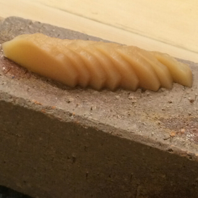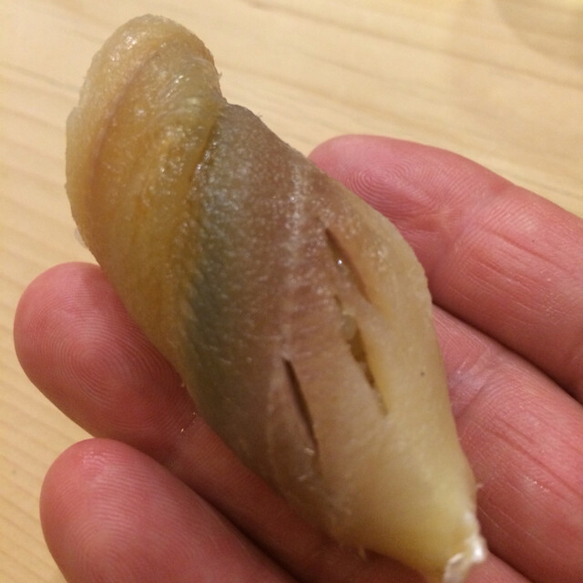 小肌 熟成させたもので酢で小骨が溶けています。 皮が上でないのが珍しいですね。