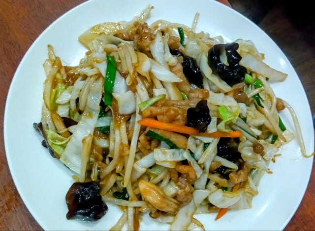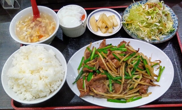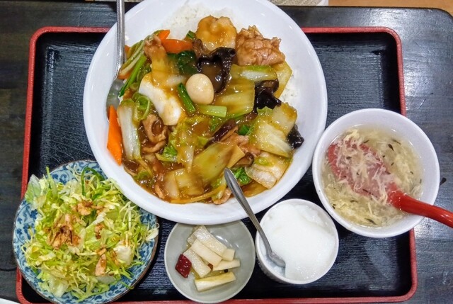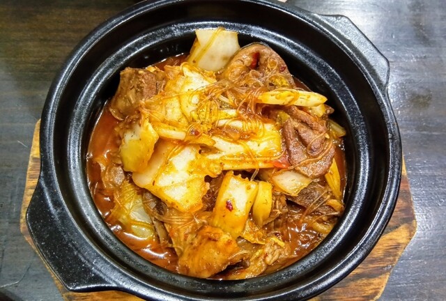 お盆に乗ったサラダ&大根のお新香(メニューにはザーサイと記入)&スープ&杏仁豆腐が付いて、牛バラとじゃが芋の醤油味土鍋かけご飯が来て、ウコン系の香辛料の薫りが食欲をそそり、味も想像を超えて美味!