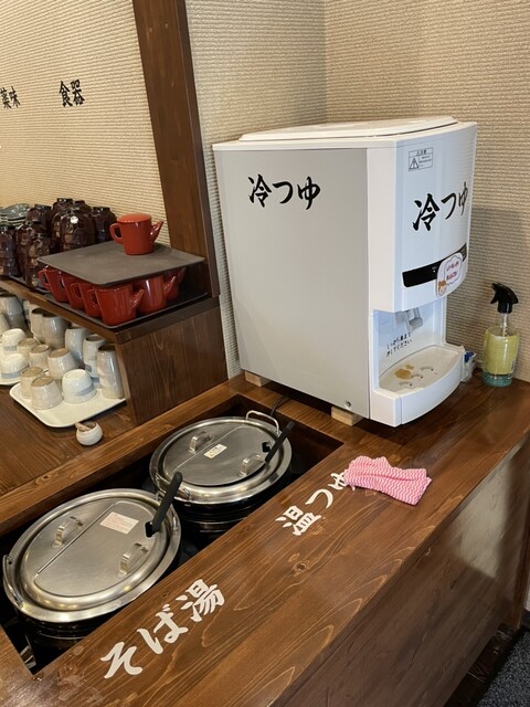 こちらの嬉しい事はセルフサービスで長ネギの薬味、わさび、冷たいのと温かいおつゆ、そば湯がフリーです。