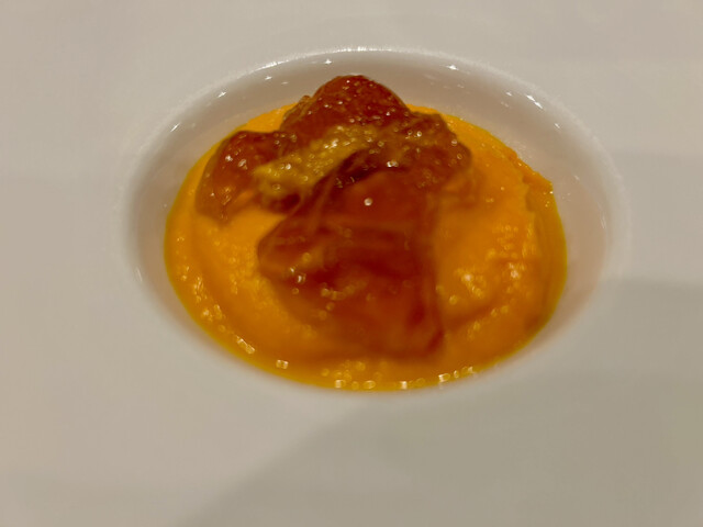 人参のムースにコンソメジュレ、そしてウニが添えられた一品は、その繊細な味わいとバランスの良さに思わず感嘆の声が漏れました…