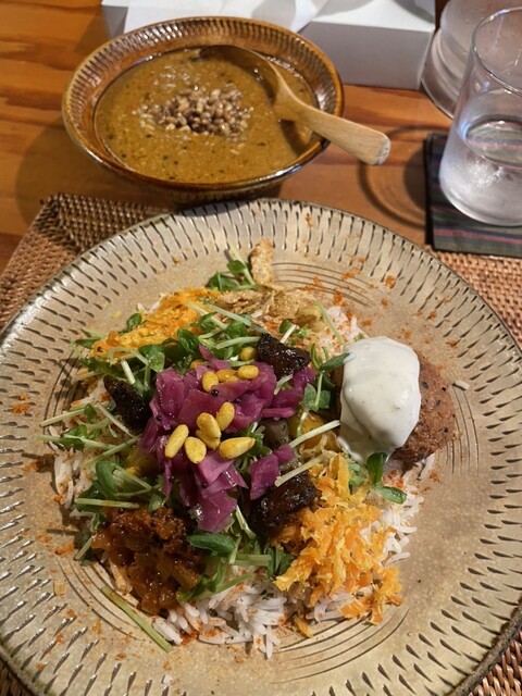 カレーは別皿で提供されます。わりとサラリとして油脂感は少ないですが、キーマはしっかり入ってます。カレーとスパイスを少しずつかけながら食べていくとかけるスパイスによって味の変化を楽しめます。私はエビチリココナッツふりかけが特に気に入りました。こんなカレー、他では食べられないと思います。スパイスが好きな方におすすめです。