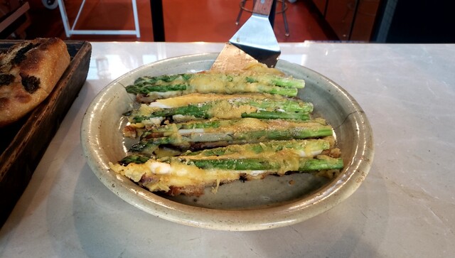 カウンターに少ない種類のパンが並んでました。週末だけ営業、2週間おきにメニューを変えてるそうです。この日は大きなアスパラのクロックムッシュ、ラザニア、オレンジやナッツが含まれたカンパーニュを購入しました。