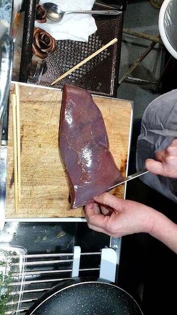 生の、牛レバーじゃ!! 自己責任で、生で食ってみるか? いやいや、無謀じゃ 止めておこう