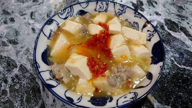 【塩麻婆豆腐】 けん坊ママ作 旦那は料理人で、直伝! 金曜に食った時、激辛の ”朝天辣椒” を入れ過ぎた! これはマジで辛いっ!!! (>_<)