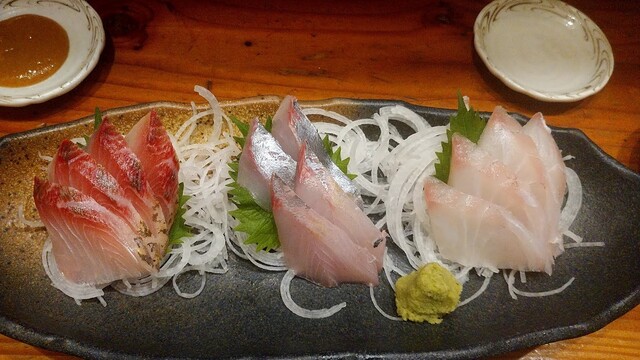 【横須賀地魚刺盛3種】 1580円 ボラ刺・モクアジ刺・ブダイ刺