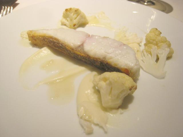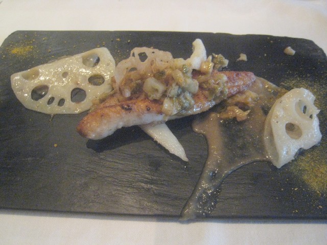 他席でホウボウのポワレが出ていたので遂に再会できるか?と思ったが違った。まあ鯛も美味しいですが。鱗は松笠焼き。シェフは和食も出来ると言っているが実際こういうのも上手い。鱧の骨切りもしていたし。ねっとりとした部位は内臓だろうか。ワインは淡い林檎香。甘さと青っぽい酸味。