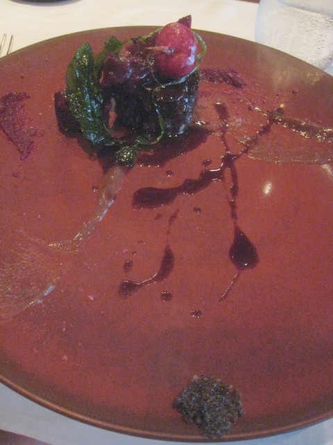 結構な回数来ているのに初めて見る料理が出てきた。またこんな物を…。後で訊いたら大量のセロリラブを扱っていたら昆布っぽい香りがした、とのこと。分からん。こういう分からなさが半ば意地になって通っていた理由でもある。ヴィネグレットソースは前にも使っていたけれど。ゲヴェルツは随分甘いけれど後から苦味も。