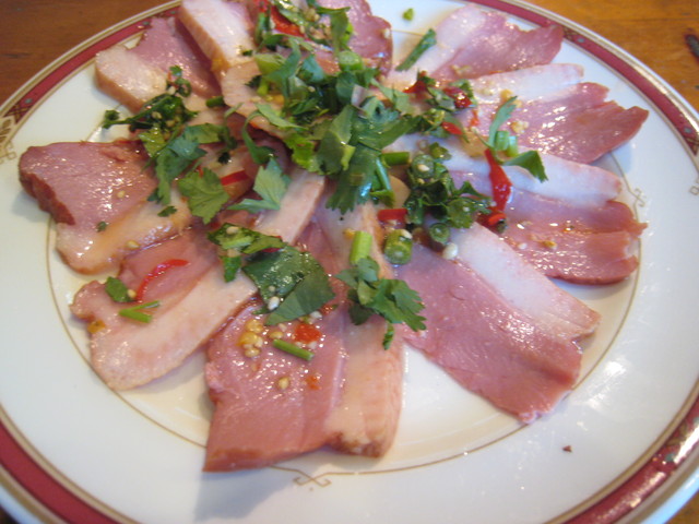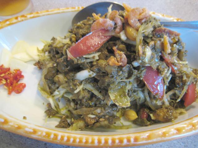 カチンお得意の山菜類、ニンニク、パクチー、唐辛子が乗っている。この説目で大体、