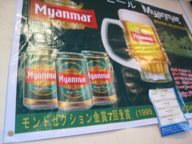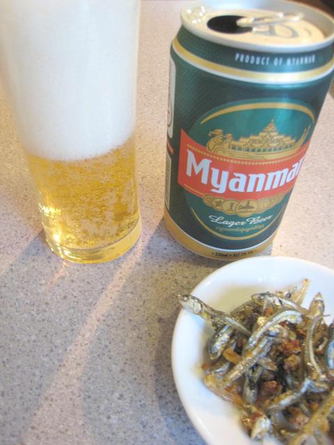 ミャンマー缶ビール・つまみ付き ¥500 典型的なダメな注ぎ方です