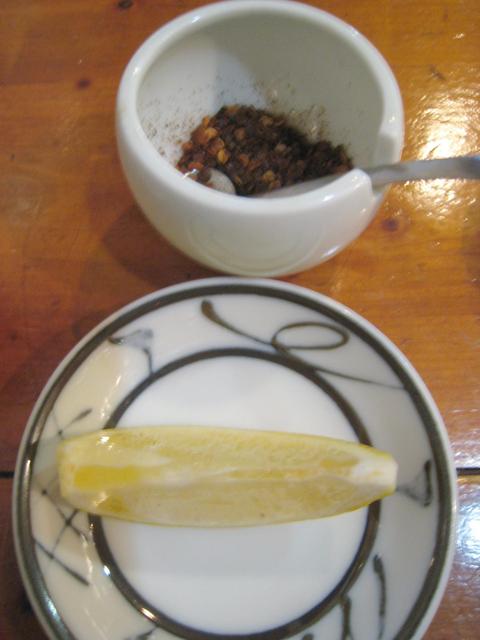 さて、裏メニュー(?)のモヒンガー。付け合わせは…レモンと、煎り唐辛子か。