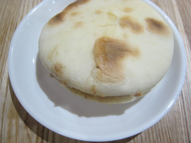 ありゃ、小さいな。2個だと¥550だったが。まあ、いいや。素焼きの白パン?に羊肉を