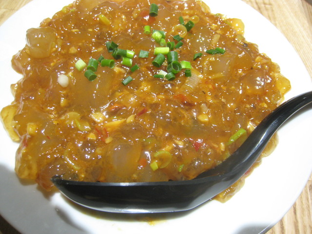 ジャガイモなどのデンプンを使った、わらびもちみたいな外見のもの。