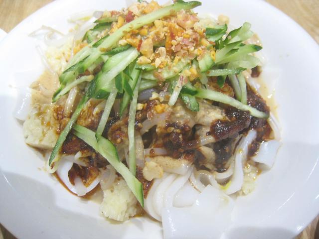 凉皮は平べったい麺。米粉版と小麦粉版があるようだが、これは白いので米粉版だろう。