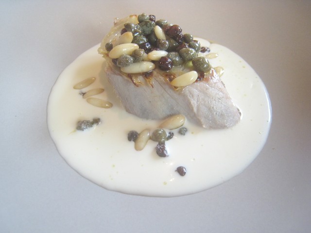 上に松の実、ケーパー、レーズン。冷たいクリームソースをかけて完成。ソースは