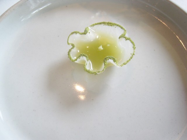 硬さで形を保っている。ジュレはレモンと後は忘れた。中央にワサビ。酸味とハーブ香。