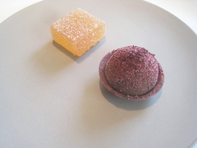 (セップ茸の冷たいショコラ?、パート・ド・フリュイ、カシスとフランボワーズのチョコタルト?)