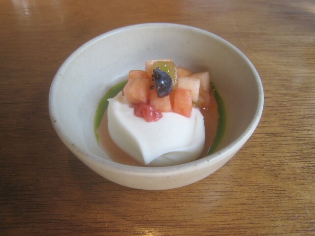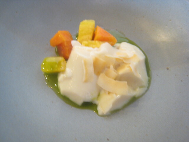 ピエモンテの牛乳デザート。パパイヤ、マンゴー、ココナッツ、ソースがゴーヤ(!)