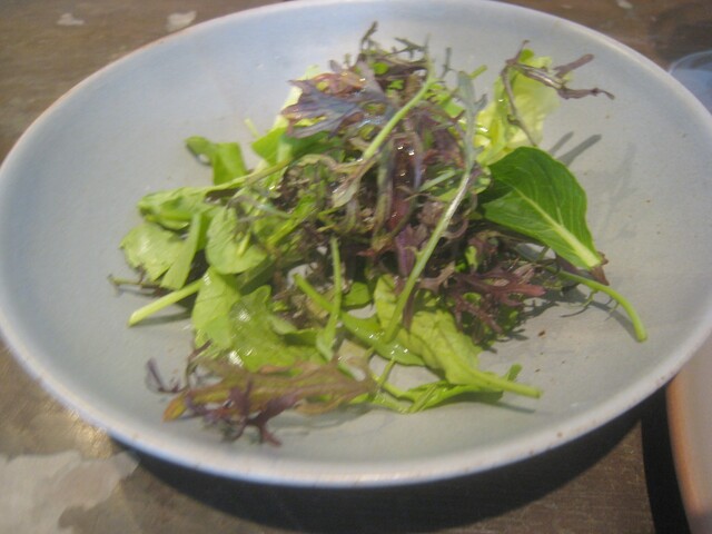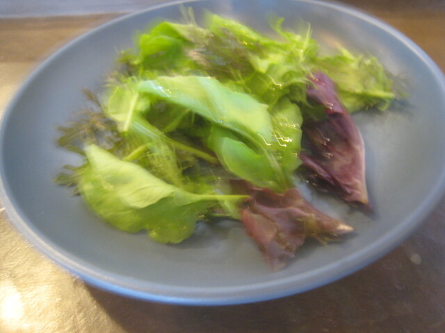 仕上がり。野菜は辛いのだがからし菜?ドレッシングに甘みがあると思ったら、ホワイト