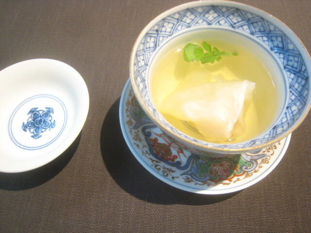 雉コンソメ?に雉入り雲呑。浮いているのはクレソンかな。余さず飲み尽くす。