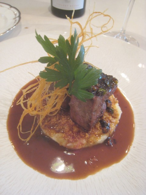 下にオレガノ風味のポレンタ、上にタマネギ。鴨もしっかりと美味しい。