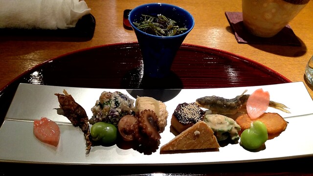 ・八寸(もずく酢・じゅん菜、炙った干しホタルイカ、白和え、空豆、イイダコ、鱈の子、芋の田楽、蘇、こごみの白胡麻和え、琵琶湖産稚鮎、からすみ揚げ)