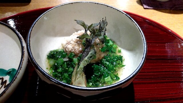 ・先付(牛スジの飛龍頭、タラの芽?の天麩羅、菜花)