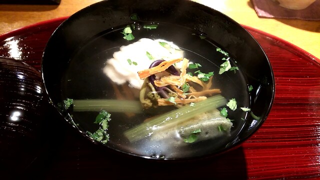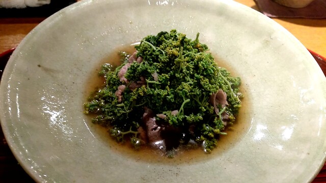 なんと。椀にばちこが(中央の細いのがそれ)。どうなのかと思ったがこれはこれでいい。その分出汁は薄くしてあり、上からかけた木の芽が支配する。後は蕗かな?