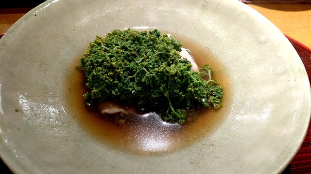 白子をこう使うか。黒いのはやはり覚えられず。白子の海にふんわりと広がる白魚だが、外側のさくっとした食感は残っていて面白い。