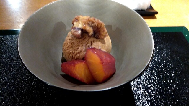 甘味(ラムレーズンアイス、胡桃のキャラメリゼ、オレンジの赤ワイン煮)