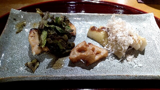 桜鱒の西京漬け、蕗味噌、蓮根、筍
