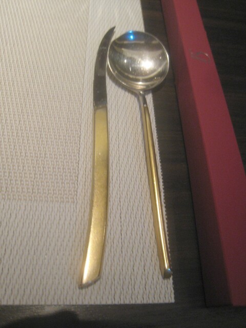 例の銀の器と銀のスプーンがおかもちで出てきた。これは定番の皿かな。見た目が