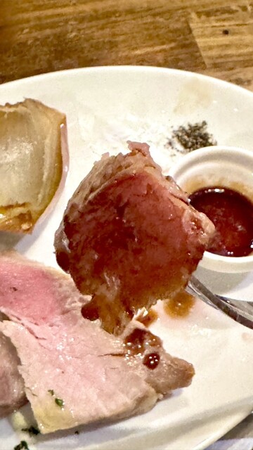 イベリコ豚のローストは、霜降りならではのジューシーな旨味が口いっぱいに広がる☺️✨絶妙な火加減でしっとり柔らかく焼き上げられ/添えられたしんなり玉ねぎは甘みが引き立ち/塩•胡椒でシンプルに味わうもよし✨