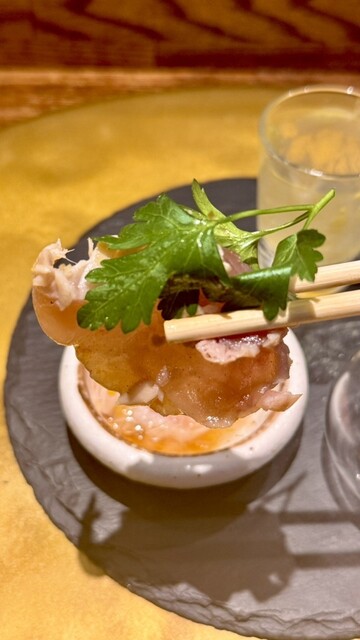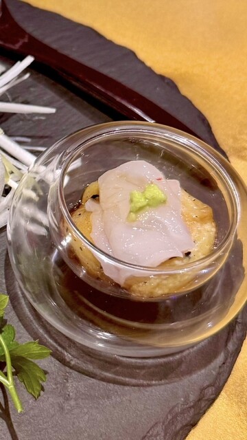 コースの序章を飾る“アミューズの三重奏”といった雰囲気。かぼちゃの冷製スープは、まろやかで自然な甘み/香ばしい焼きなすの上にはとろりとした赤海老の甘みにわさびを添えて/備長マグロの柚子胡椒は、軽く炙られた香ばしさとしっとり感。柚子胡椒がほのかに香ります。やさしい味付けで素材の旨味を生かした構成と、違いを楽しめる上品なスターターという印象です☺️✨