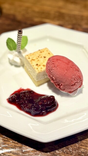 爽やかな酸味が絶妙に調和したカシスシャーベットと濃厚なチーズケーキの2品。華やかに盛り付けられたお皿は見た目にも可愛らしく、コースの締めくくりにふさわしい一皿です✨