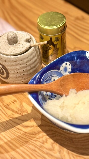 まず、香りと旨味が抜群の天つゆと大根おろし•素材を引き立てる塩が用意されます。