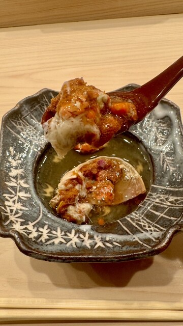 甲羅に美しく盛り付けられた香箱仕立て。内子•外子•味噌•身の旨味を一度に味わえ、松茸の香りがふわりと広がる贅沢な一品。最後、あんに溶け込んだ身をスプーンで頂きます。