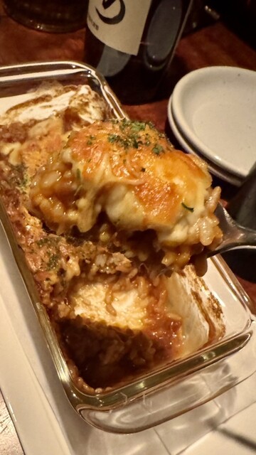 これだけ食べに来る人もいるらしい人気メニュー。耐熱ガラスで供される熱々の焼きチーズカレーは、濃厚なチーズと程よいスパイスが重なり合います。