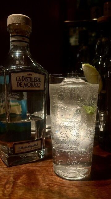 ラ•ディスティレリ•ド•モナコのジンを数種テイスティングして1種をセレクト。ライムをひと搾りしたジンソーダは柑橘の香りと澄んだキレが心地よい。
