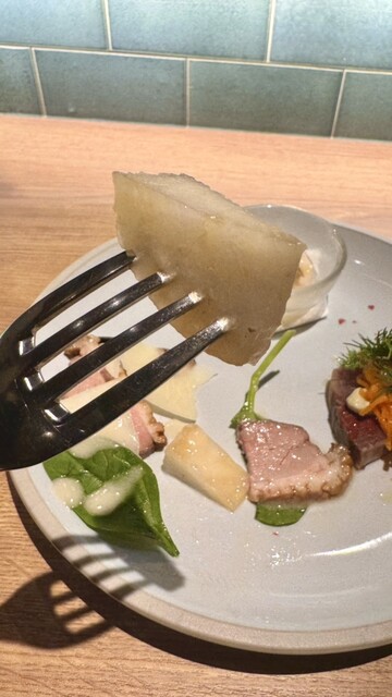 しっとりとした近江鴨の旨味に、ラ•フランスのやさしい甘みが重なります。果実の酸味とチーズのコクが調和し、鴨の味わいを引き立てる一品。